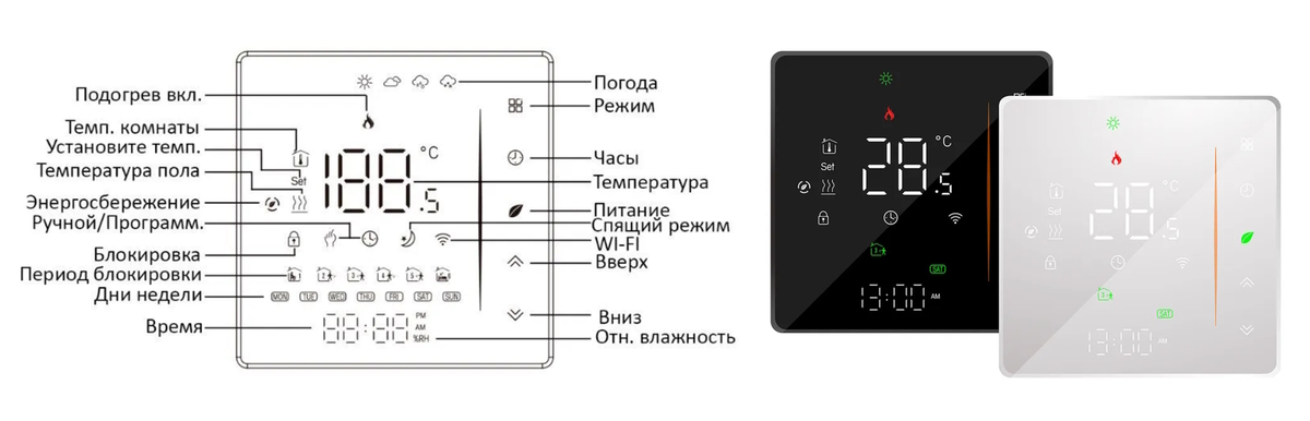 • ЖК дисплей с подсветкой и индикацией времени и дня недели; • 6 периодов работы на каждый день недели с возможностью установки температуры для каждого периода; • функция адаптации (заблаговременное включение системы обогрева для достижения требуемой температуры к началу каждого периода времени); • выбор датчика температуры (пол, воздух/пол/воздух+пол); • режим «в отъезде»; • режим поддержания постоянной температуры; • функция блокировки кнопок от случайного нажатия; • ограничение температуры пола; • интеграция с системой «умный дом»; • встроенная система контроля исправности датчика температуры воздуха и датчика температуры пола.